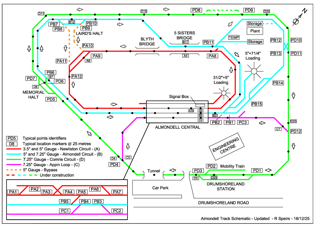 When planning your visit to Almondell with a 7¼” locomotive and / or carriages please note our clearance requirements. If your rolling stock is outwith these parameters then you will not be able to run as they will foul our structures. If in doubt please contact the ESME Secretary.